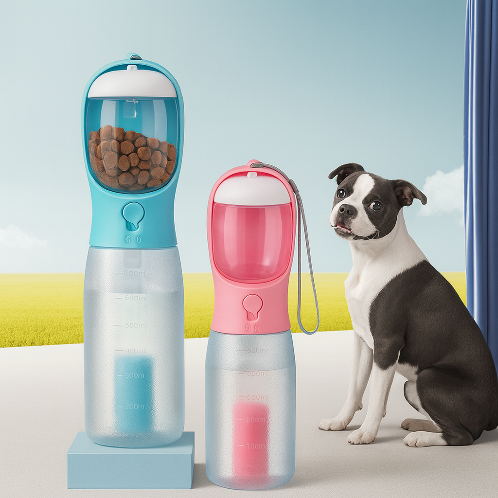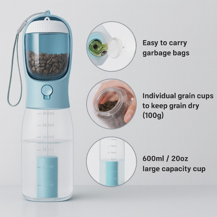 Keep your Pet happy and hydrated anywhere – water, food & waste bags all in one.